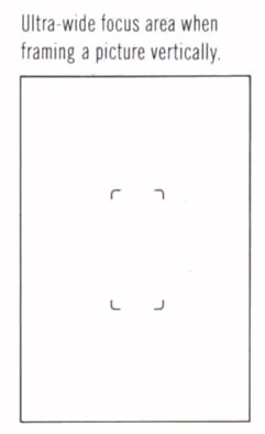In most situations, the Dynax 9xi's ultra-wide focus area, using four AF sensors, appears in the viewfinder. When you hold the camera vertically the optimum focus frame for vertical shots, using three AF sensors, is automatically indicated. One of four local focus areas may also be temporarily selected using the Quick button or locked using the function button and front control dial. | |